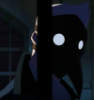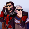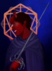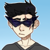 Description: A portrait of a white person with somewhat spikey black hair, triangular sunglasses, and a scar across their left eye.