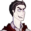 Description: Tremere looking and smirking at the viewer. He is a pale man with brown eyes, black hair, and fangs, and is wearing a formal red outfit.